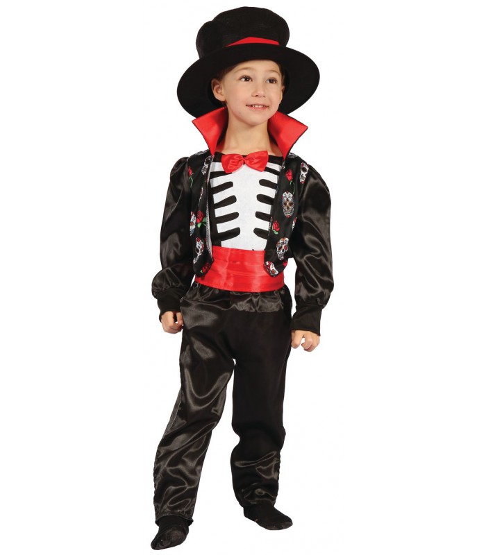 Diese "Totentag" Verkleidung, in Luxus-Version, umfasst eine seidige Hose, ein Top mit einer angebrachten seidigen Jacke, die mit Totenschädel bedruckt ist, und eine rote befestigte Fliege. Ebenfalls enthält sie einen roten Gürtel und einen Hut.