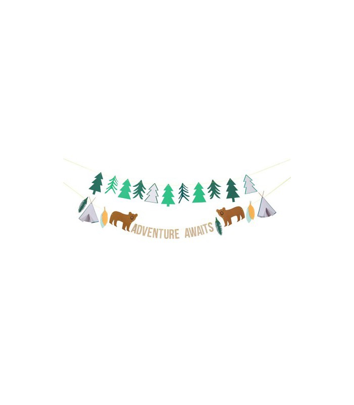 Eine wunderschöne Geburtstagsgirlande zum Empfang Ihrer Abenteurertruppe! Wimpel aus Holz und Pappe in Bären-, Tipi- und Baumgestalt und eine "Adventure Awaits"-Nachricht verzieren diese Girlande. Stürzen Sie sich in das Abenteuer !