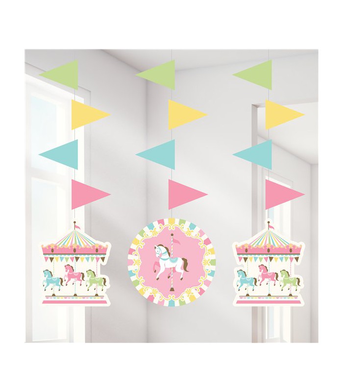 Jede Packung enthält 3 Hängedekorationen von unserem Thema Karussel. Einfach über Ihren Tisch aufhängen, wo sie mit ihren Wirbelbewegungen in der Luft auffallen werden!