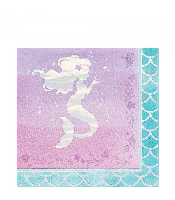 Jede 3-fach gefaltete Papierserviette bietet ein hellrosa, lila und blaugrünes Farbschema, das am Rand durch ein Skalenmuster ergänzt wird. Außerdem sind die Meerjungfrau und die Schuppen in schillerndem Farbton, für einen Hauch von Meerjungfrauenzauber !