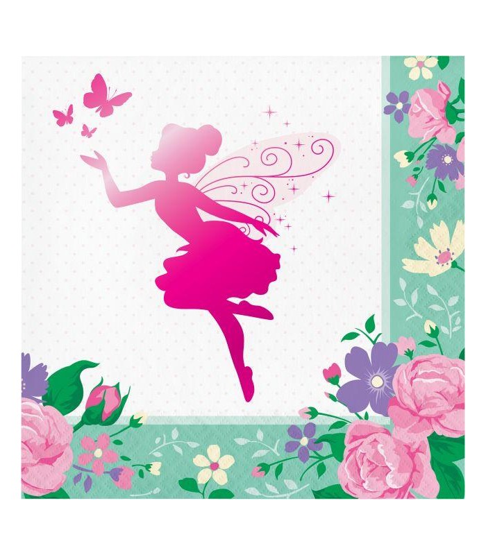 Große Servietten bedruckt mit Feen, Blumen und Schmetterlingen, die zusammen kommen, um die Geburtstage kleiner Mädchen zu feiern.