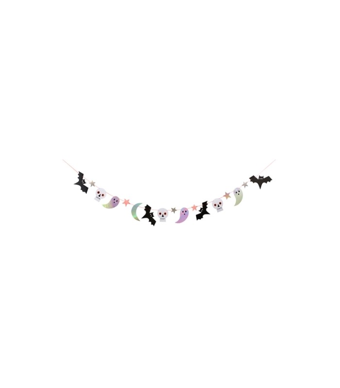 Girlande mit Fledermäusen, Totenköpfen, Geistern und anderen Symbolen und schillernden Details. Perfekt für die Dekoration Ihrer Wände oder zum Aufhängen am Eingang Ihres Partyraums um Ihre kleinen Monster zu begrüßen!