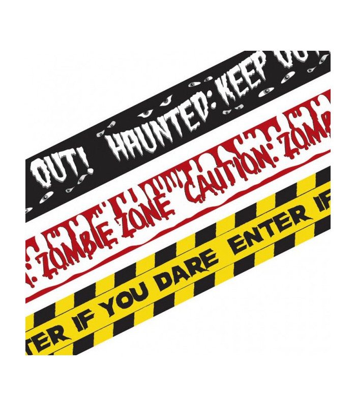 Ein Satz von 3 Halloween-Bändern aus weichem, dünnem Kunststoff. Perfekt, um Ihre Halloween-Partydekoration fertigzustellen und auch um bestimmte Räume Ihres Spukhauses abzuteilen oder zu schließen ! Mit diesen Halloween-Bändern kann man sagen, dass Sie vor der Gefahr gewarnt wurden, die Sie eingehen, um gewissen Zonen zu betreten!