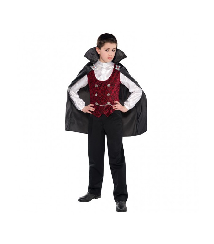 Unsere Dark Vampire Verkleidung verfügt über ein seidiges, weißes Hemd mit langen Ärmeln; daran ist befestigt eine rote Weste mit Brokatmuster, silberfarbene Knöpfe und Kettchen. Der schwarze Umhang mit hohem Kragen hat vorne Medaillons und ein Kettchen.