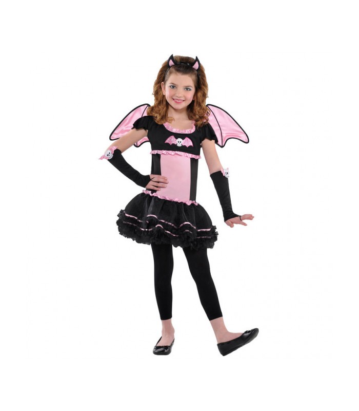 Dieses Fledermaus 'Bat tot he Bone'-Kostüm enthält ein hübsches schwarz-rosa Kleid mit einem Totenkopf auf der Vorderseite (das Röckchen ist ein schwarzes Tutu), rosa abnehmbare Flügel, schwarze lange fingerlose Handschuhe mit Totenköpfen und ein passendes Stirnband mit Fledermausohren. Schwarze Leggings vervollständigen das Kostüm.