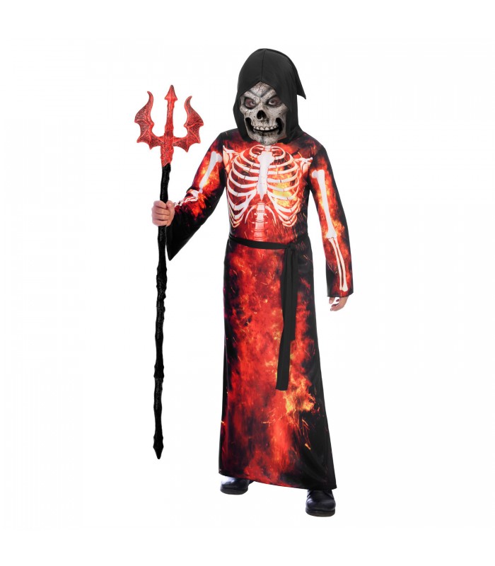 Diese Verkleidung enthält ein integrales Kapuzenkleid, das mit einem Skelett und im Hintergrund mit einer Feuerszene bedruckt ist. Ein schwarzer Gürtel um die Taille und eine graue Skelettmaske runden diese Verkleidung ab.