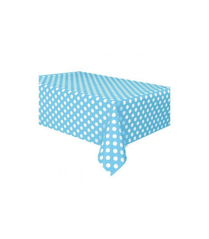 Himmelblaue Plastik-Tischdecke mit Tupfen. Abmessungen: 137cm x 274cm