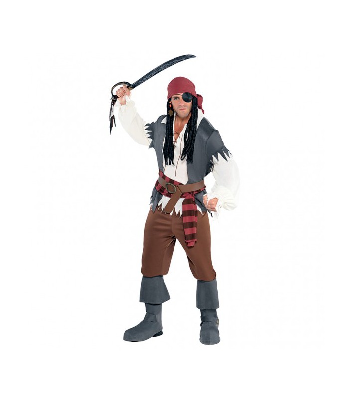 Dieses tolle Piraten-Kostüm für Herren besteht aus einem weißen Hemd mit V-Ausschnitt und Puffärmeln, einer daran befestigten Kunstleder-Weste und einer braunen Hose mit goldbraunen Fransen. Diese Verkleidung wird mit einem Kopftuch, einer gestreiften Schärpe und einem braunen Gürtel vervollständigt. Ideal für alle Rollenspiel-Anlässe!