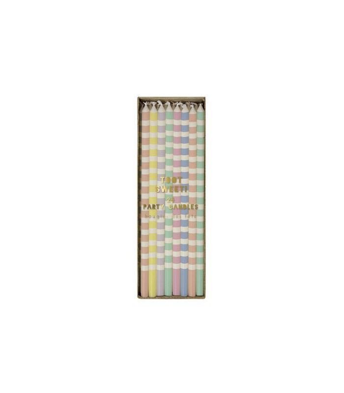 24 Kerzen mit Pailletten für eine fröhliche und bunte Dekoration der Geburtstagskuchen. Größe der Kerzen : 15 cm. Meri Meri.