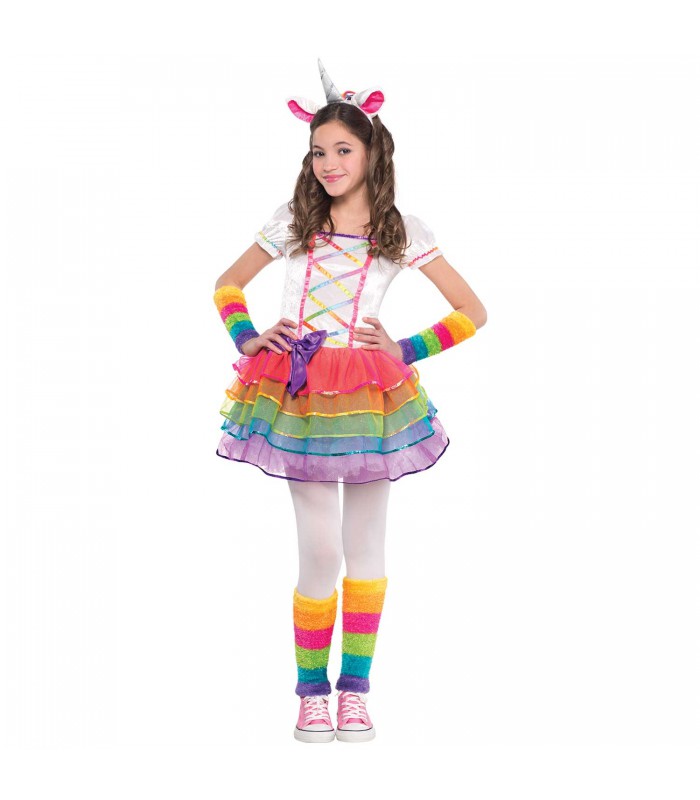 Verwandeln Sie Ihr Kind in ein Regenbogen-Einhorn mit diesem fantastischen Märchenkostüm - perfekt für Mädchen voller Fantasien! Verkleidung beinhaltet ein Kleid mit einem weißen Samtoberteil mit lila Pailletten und einem gekreuztem Band in Regenbogenfarben, der Rock ist ein buntes Tutu mit einer lila Schleife und einem Schwanz auf der Rückseite.