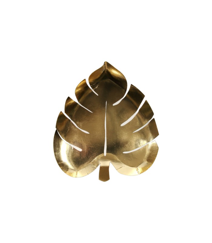 Diese palmenblattförmigen Pappteller von metallisch goldener Farbe sind ideal für eine exotische Party !