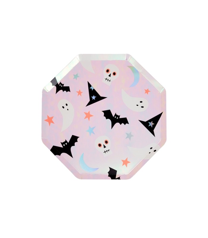 Totenköpfe, Geister, Fledermäuse und Hexenhüte sowie einige holografische Details vereinen sich, um wunderschöne gruselige Halloween-Teller zu gestalten!