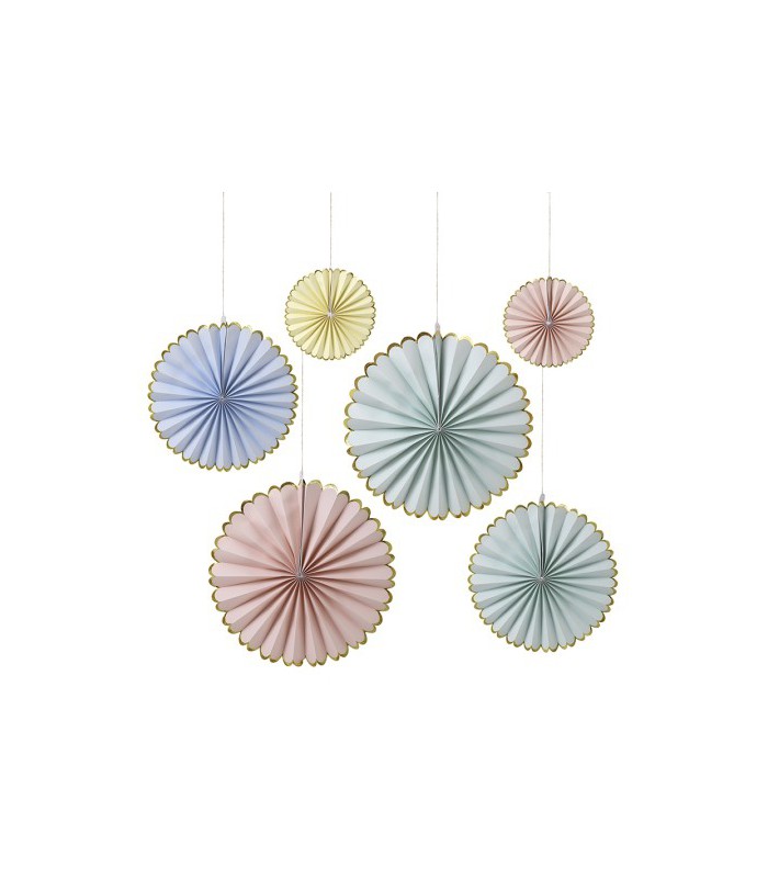 6 Rosetten aus Wabenpapier in zarten Pastellfarben.und mit einem Goldrand verziert. Diese wunderschönen Rosetten dekorieren Ihre Wände mit einer originalen Note und verschaffen auch einen idealen Hintergrund für das Photobooth!