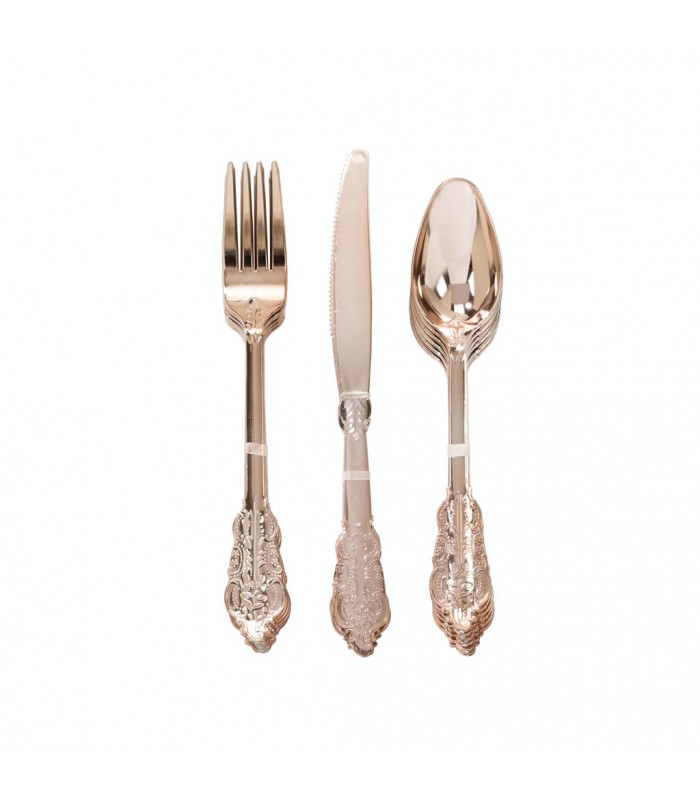 Praktisch, elegant und rosegolden! Erfreuen Sie Ihre Gäste mit unserem eleganten Einwegbesteck aus unserem Sortiment Party Porzellan. Dieses schillernde Set ist perfekt für Buffets, Picknicks oder sogar Abendessen und verfügt über ein elegantes Motiv am Griff.