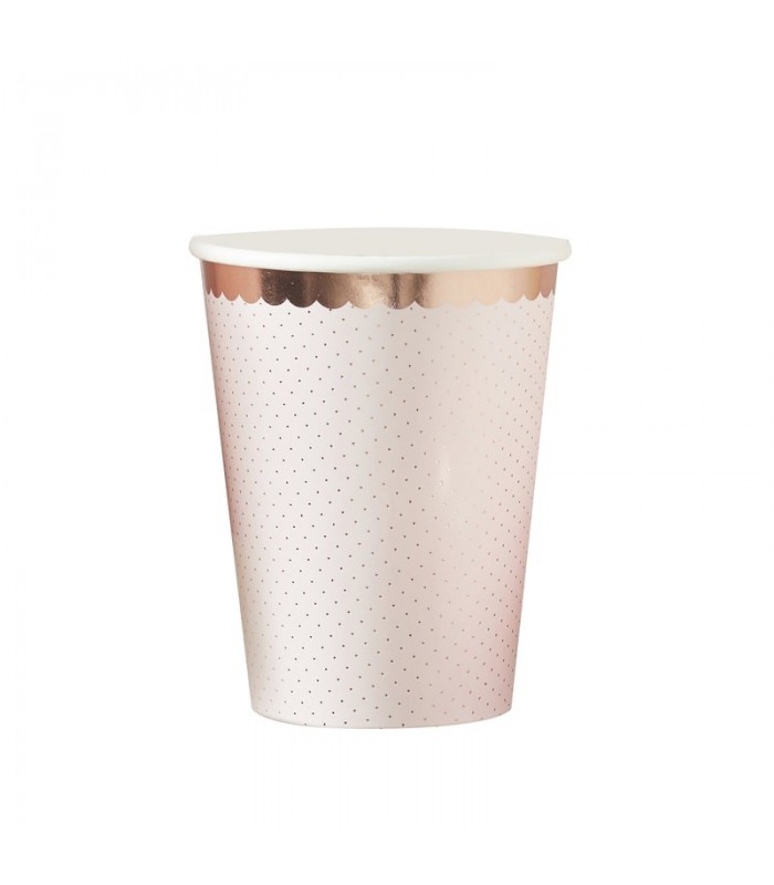 Dieser schöne Becher mit pastell-rosegoldenen Tupfen wird Ihrer feierlichen Tischdekoration den letzten Schliff geben. Die Becher sind mit Rosegoldfolie verziert und bringen Glanz in Ihren Abend !