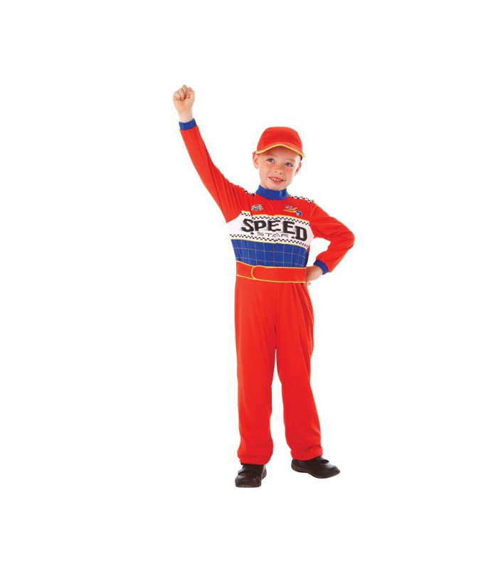 Unsere Rennfahrer-Verkleidung besteht aus einem "SPPED" gedrucktem Overall und einer Mütze. Welcher Stolz, in die Haut eines Rennfahrers zu schlüpfen! Das Kostüm enthält : - Overall - Mütze