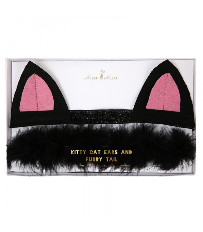 Ein süßes Katzen-Kit bestehend aus einem Stirnband mit Katzenohren. Kleine Ohren aus schwarzem und rosa Filzstoff und ein kleiner schwarzer Schwanz aus ganz weichen Boa-Federn. Das Ganze wird befestigt mit einem schwarzen Scratch-Gummiband mit Pailletten. Einfach hinreißend, dieser kleine stilvolle Katzenschmuck!