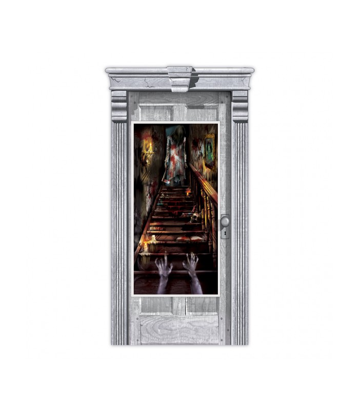 Dieses Türplakat mit einer Treppe im gotischen Stil ist einach gruselig und es ist auch einfach aufzuhängen ! Befestigen Sie einfach diese Türdekoration an jeglicher Tür, innen oder außen, und Ihre Halloween-Party ist bereit zum Erschrecken !