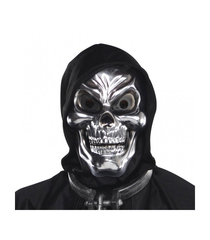 Our Silver Skull Mask features a skull design with exaggerated cheekbones, a chiselled chin, black eyes, and bared teeth. The Silver Skull Mask's brow is furrowed and its eyes wide open for a crazed and monstrous look. The plastic construction is lightweight and an elastic strap provides a comfortable fit.