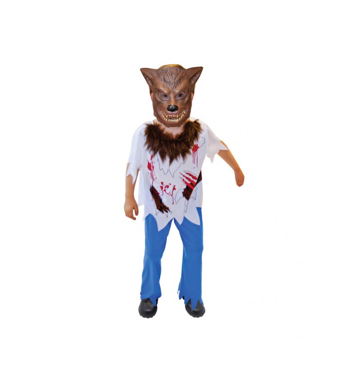 Boys Werewolf Costume features a tattered white shirt with a realistic graphic. Hairy collar is attached and werewolf costume is completed with a mask and blue trousers.