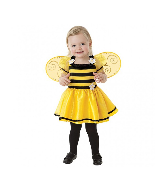 Our Baby Buzzy Bee Little Stinger Costume features an adorable black and yellow striped dress with a full yellow skirt and daisy flower appliques. Detachable swirled yellow wings, included!