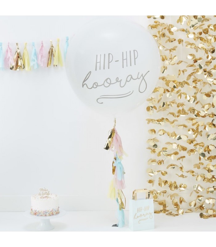 Wow your guests at your next party with this gorgeous Giant Balloon kit which comes complete with tassels! The giant balloon has a cute Hip-Hip Hooray design and looks stunning with the gold, pink, blue and yellow tassels. Simply blow up the balloon and attach the tassels to the clear string provided. You can then hang this from the balloon to create a show stopper at you special celebration!