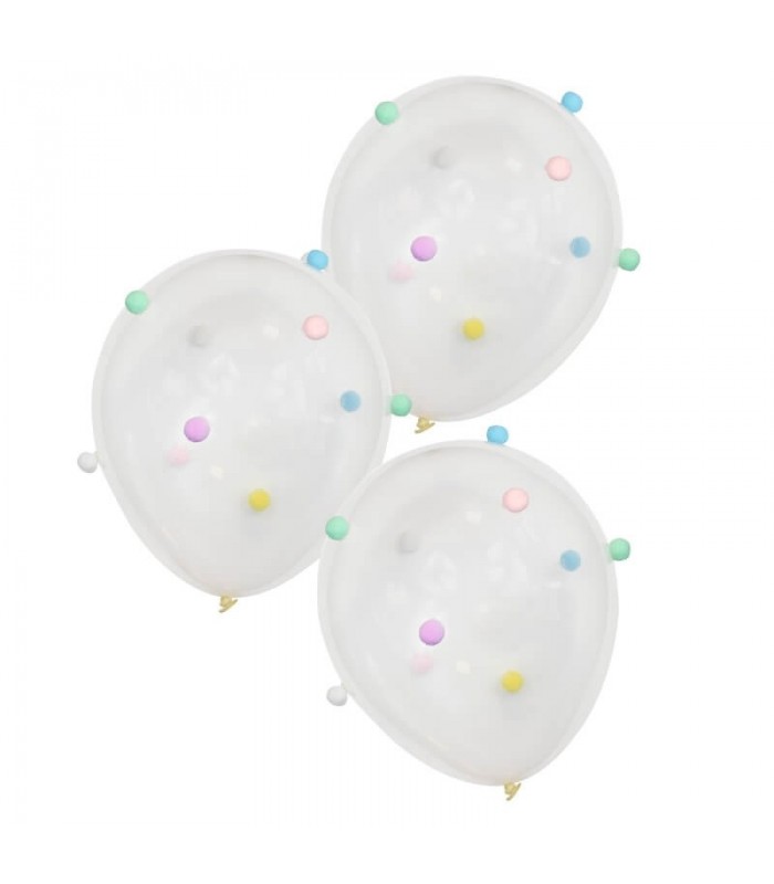 Pack includes 5 x 12" balloons and 50 pom poms which can be stuck with glue dots included in pack.