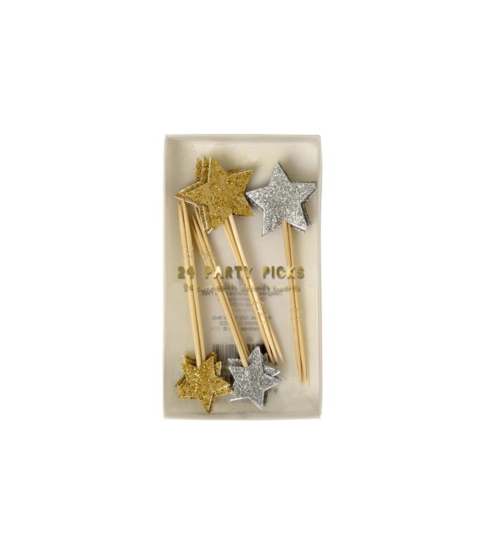 These shimmering party picks will light up your Christmas or New Year celebration. They are decorated with silver and gold stars coated with sparkling glitter.Pack contains 24 party picks in 2 styles.