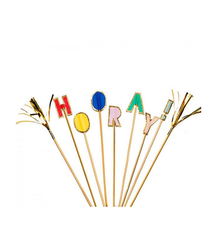 Hip Hip Hooray! Three cheers for these cute cake toppers created using clear iridescent acrylic for a special effect! The toppers are embellsihed with silver and colored twine.