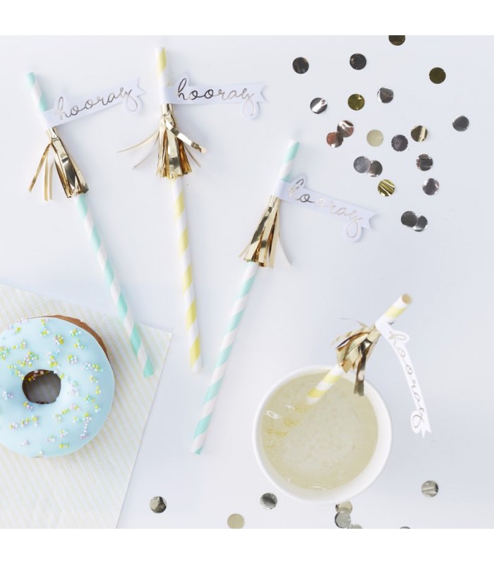 These pastel Paper Straws are not like any you've seen before! The perfect trendy addition to your party drinks. The straws each have individual gold tassels and a cute Hooray flag which is foiled in gold! Use the mint green and yellow straws for the perfect party setup.