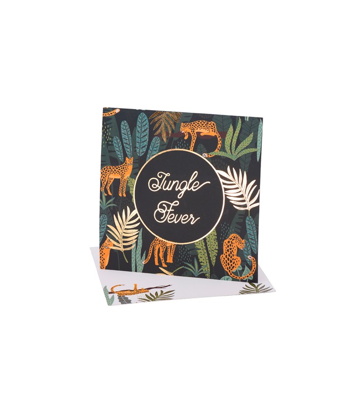 Get into jungle fever ambiance with these trendy party invitations, featuring a jungle green and gold print. These invites are perfect for a dinosaur, jungle, safari, or tropical theme party with an exotic twist! They are a perfect fit for the king of the jungle!