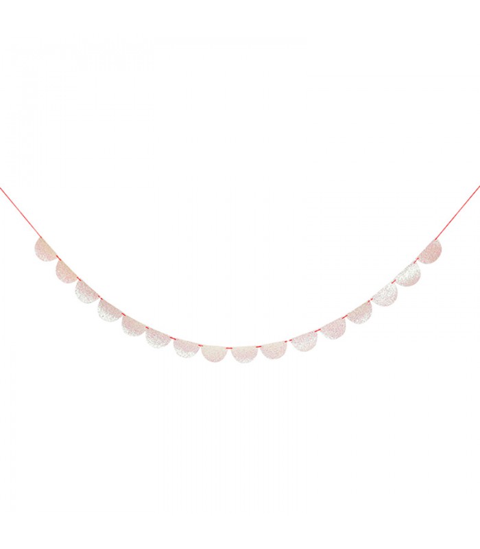 A stylish garland that will add sparkle to your parties with its row of semi-circle pennants coated with chunky iridescent glitter and suspended from a coral pink satin ribbon.