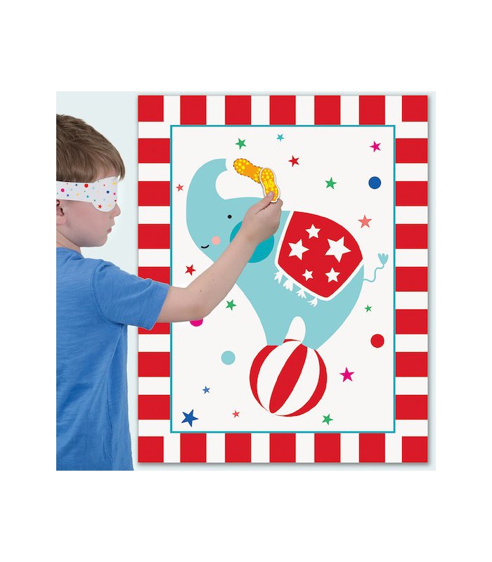 Circus Carnival party game to fix on wall. The player who sticks his sticker the nearest to the indicated spot wins. Laugter guaranteed specially if you turn the kids on themselves before placing them in front of the game. Make sure to have party favor prizes for the players.