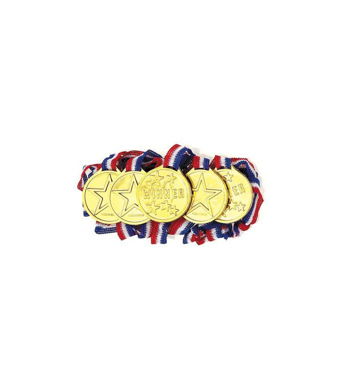 Each package contains 5 winner's medals. Red, white and blue ribbon with round plastic gold medal attached to put around your champions necks!