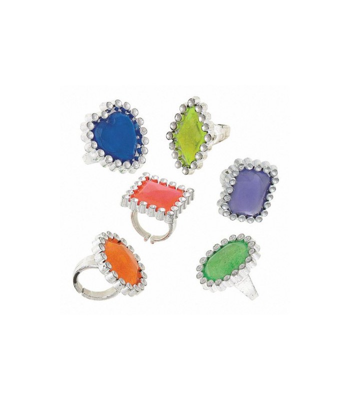 These plastic gemstone rings feature colorful gemstones with metallic silver bands in a variety of cute shapes, including hearts, ovals, rectangles, and diamonds. They're perfect for party favors or wearing in fun dress-up games.