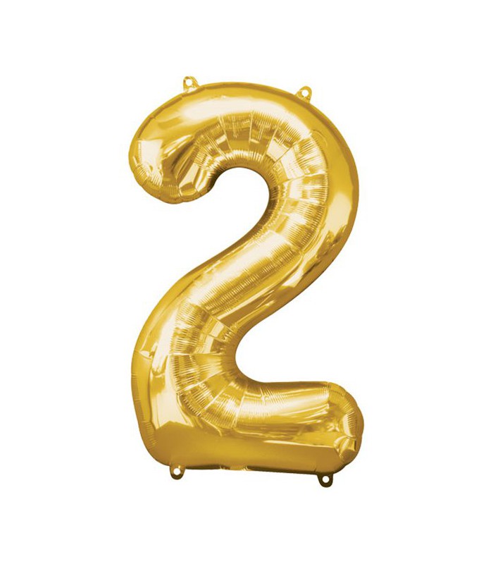 Golden "Super Shape" metallic Mylar balloon that will decorate and indicate with style the number 2!
