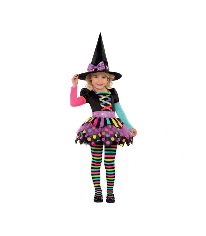 This Halloween outfit features a tutu style dress with a rainbow lace-up bodice, a frill skirt with layered multi coloured polka dot and vertically striped print and two tone coloured sleeves. Finishing this Witch costume is the all important black pointy hat decorated with a purple bow accent.