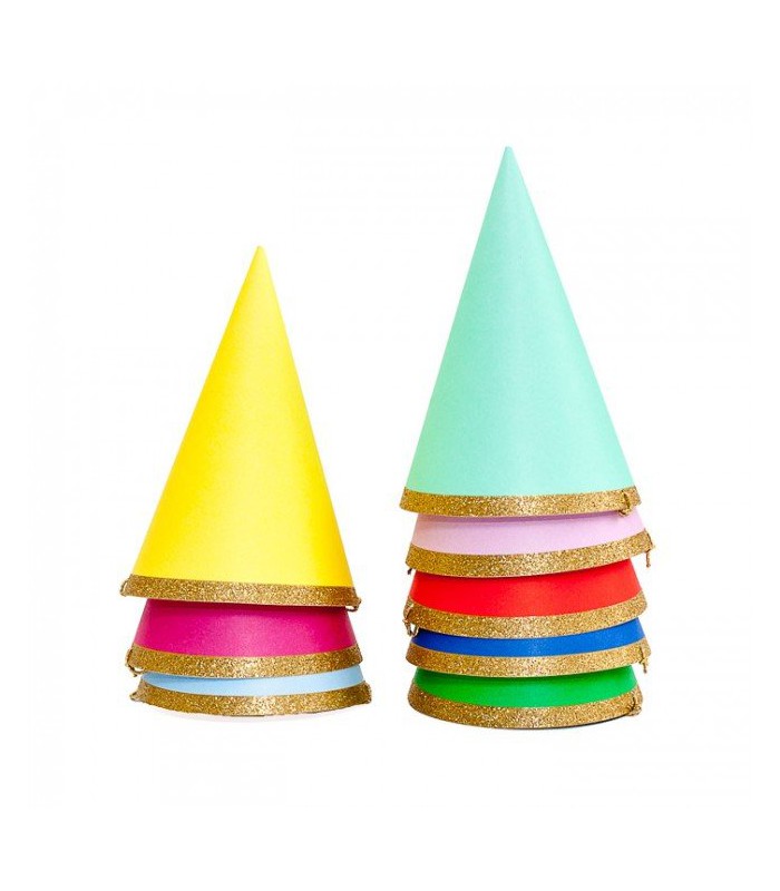 Top your party off with these fabulous brightly colored party hats. Embellished with gold glittered border they each come in a different color. Your guests will look fab with these on!