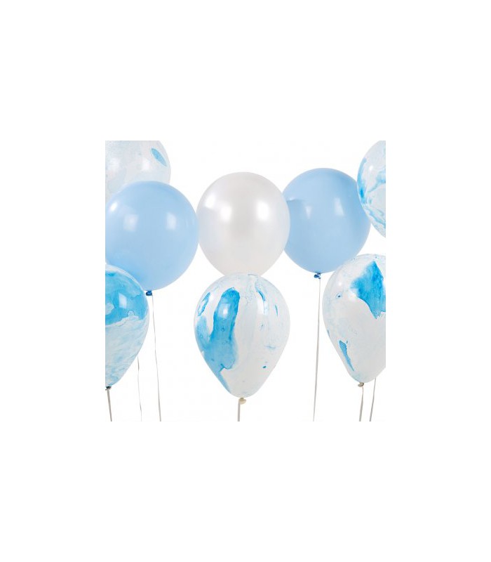 Each pack contains 12 stunning balloons in 3 designs, and 20m of curling ribbon. Contains: 6 x marble blue, 3 x pearl blue, 3 x pearl white party balloons