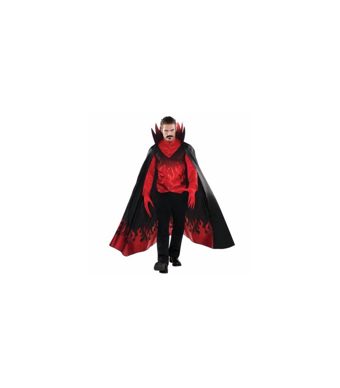 This Devil Diablo Costume for adults, features a red shirt with skull buttons and an attached vest with fire print. A menacing black cape has holographic flames licking from the bottom and a flame collar flaring behind the head. The evil and final touch is assured by red gloves that end in disturbing points at the fingertips.