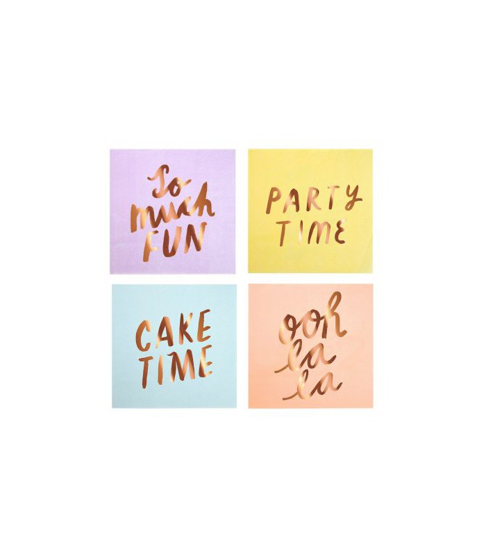 A set of 16 colorful pastel party napkins. Each one is embellished with shiny rose gold foil lettering spelling out fun slogans for a festive and stylish party! Sure to make your guests shout "Ooh la la"!