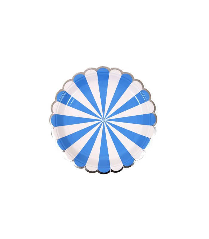 Each package contains 8 pretty paper plates with a radial blue and white stripe pattern. They are perfectly finished off with a silver foil band around the pretty scalloped rim. Dimenion: 18cm