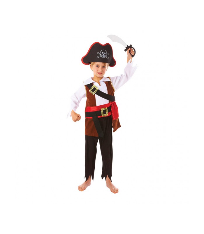 Our Treasure Pirate Costume is ideal for every pirate party! It features black cropped trousers, a shirt with belt and scarf details, together with an EVA hat with printed skull on the front. The pirate's look is completed with a role-play sword to give to every child the feeling of a real pirate's adventure!