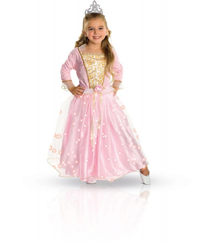 This costume includes:Satin dress with petticoat in shimmering tulle, bust with embroidery, long sleeves with golden woven yarns, collar and wrists in veiled fabric, sewn flower and ribbon. The tiara is not included.