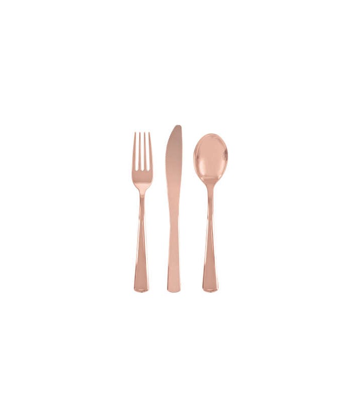 Each package contains 18 rose gold plastic cutlery: 6 forks, 6 spoons and 6 knives. They will add a glamorous and elegant touch to all your events! Washable and reusable