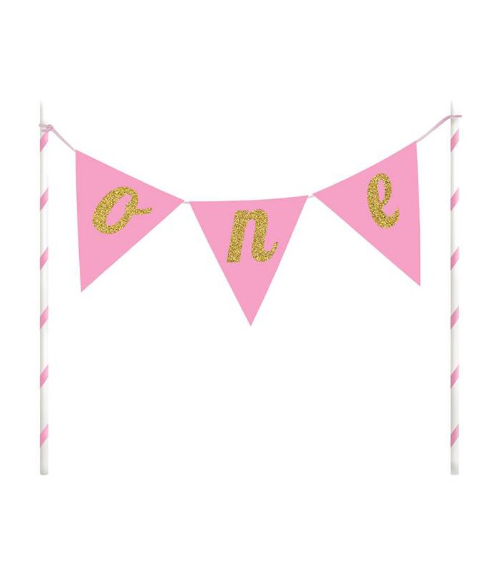 Dress up your daughter's first birthday cake with this pretty pink and gold "one" pennant cake topper.