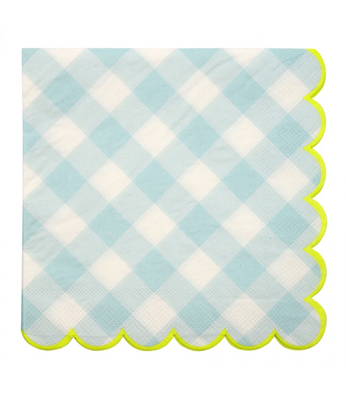 Decorated with an elegant gingham pattern in pale blue, these stylish large napkins are finished with a scollop edge with neon green border.