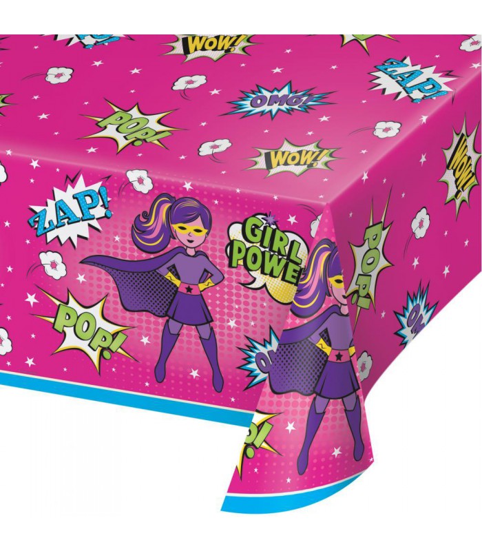 Superhero Girl plastic table cover. It will decorate your party table while protecting it from any accidental spills.