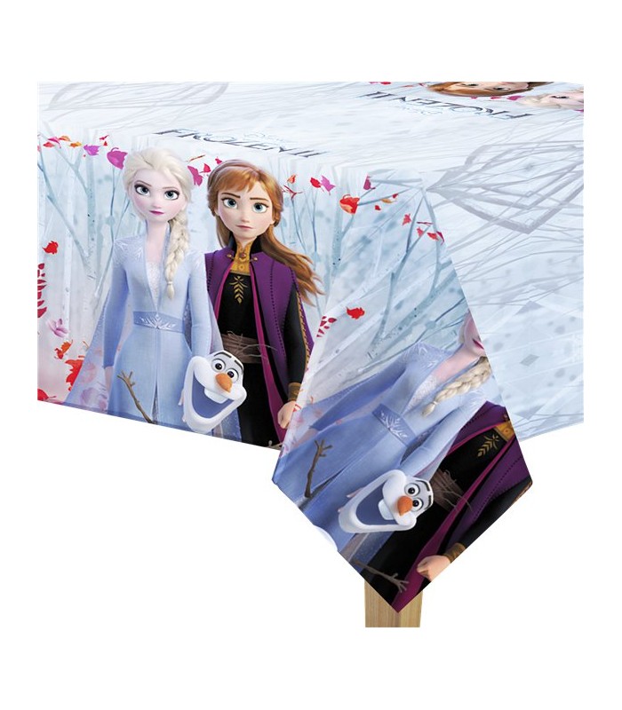 Plastic Tablecover with the image of Anna and Elsa the famous sisters of the animated cartoon Frozen II for a beautiful birthday table decoration.