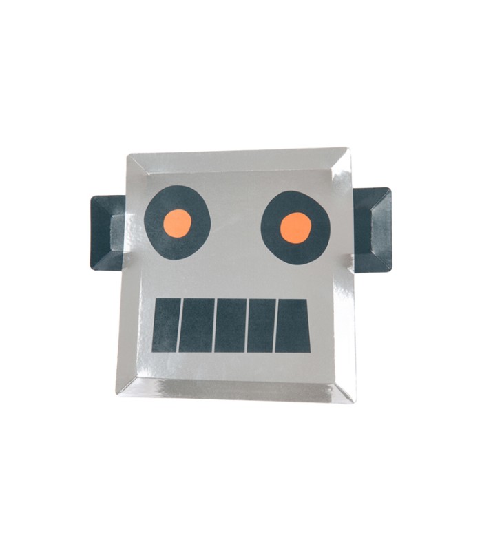 Host the best party with these super shiny robot plates made with silver foil coated card.